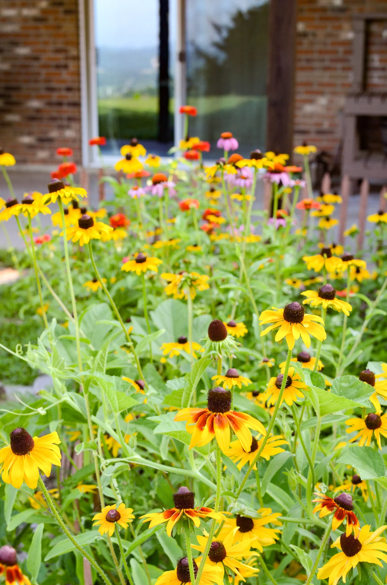 Here’s a lower section of the garden. Rudbeckia, Echinacea, and zinnias are my summer rockstars! They are drought tolerant, easy to grow, and I absolutely love the color combination. Zinnias attract LOTS of butterflies, and Echinacea and Rudbeckia provide great habitat for pollinators.