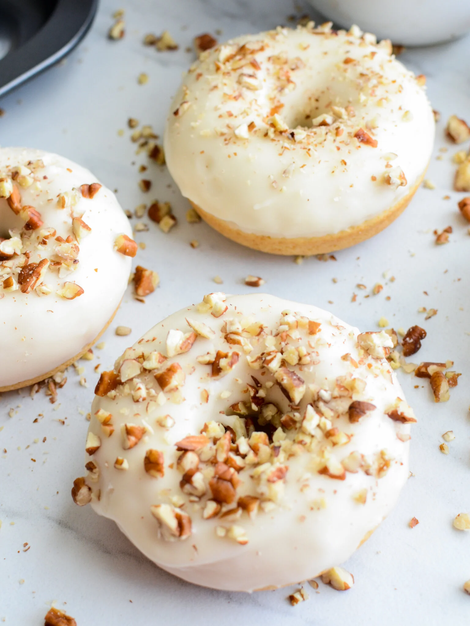 You’re going to love today’s recipe! These Maple Pecan Baked Donuts are light and fluffy with just a hint of maple! Glaze them with a creamy maple glaze and top with chopped pecans. Happy baking!