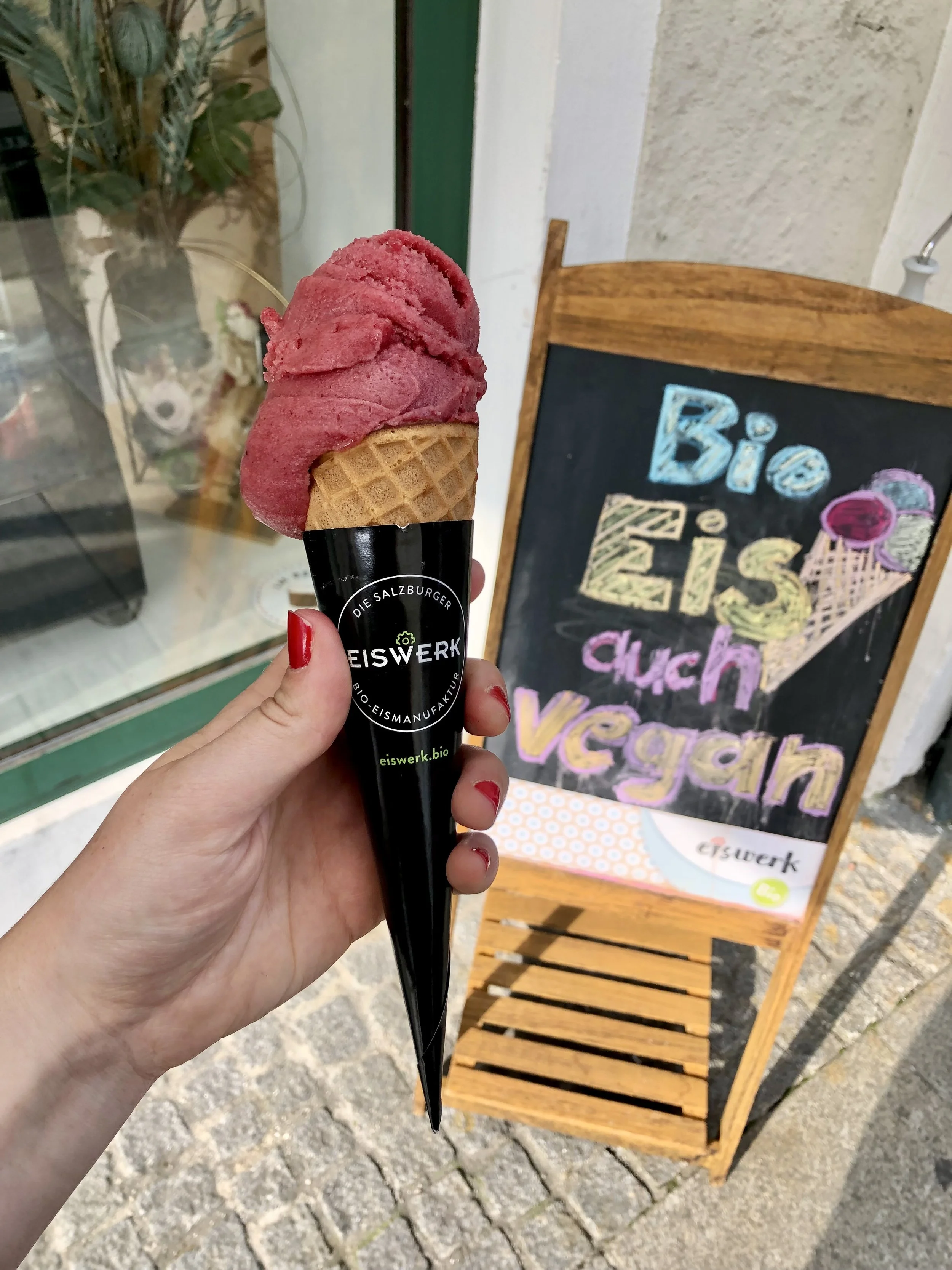 Vegan elderberry ice cream from Eiswerk in Aldstadt Salzburg in Unversitätsplatz (University Square)