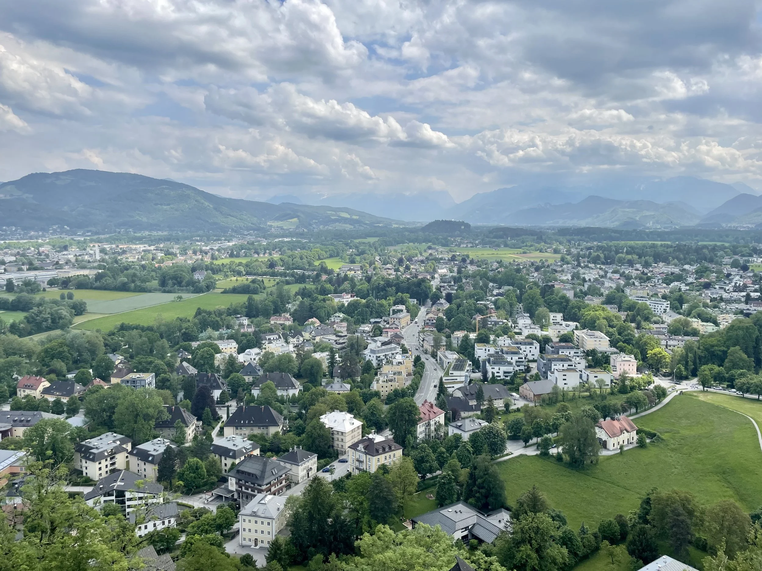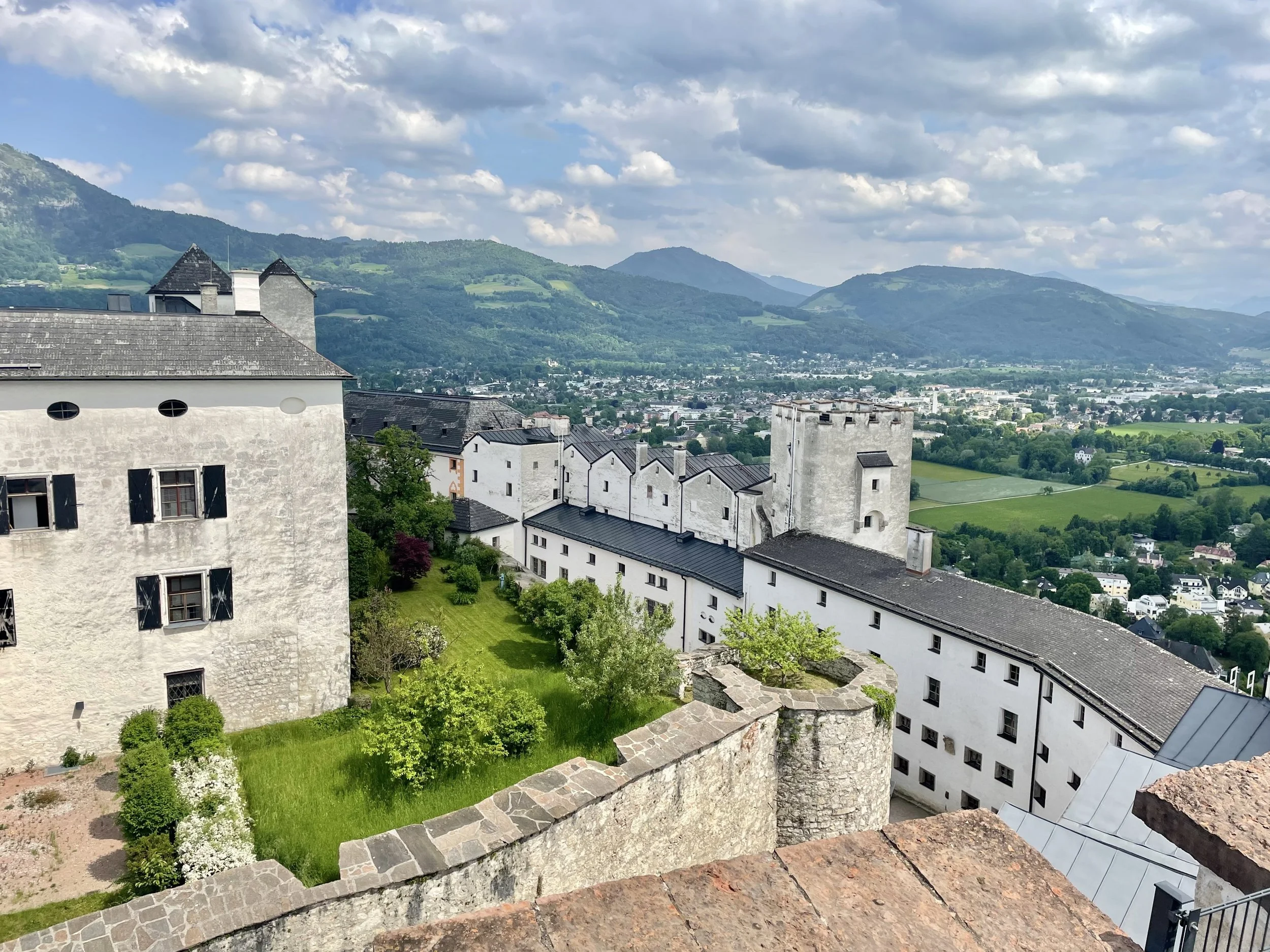 A bird’s eye view of Fortress Hohensalzburg, looking east toward the Alps of Upper Austria