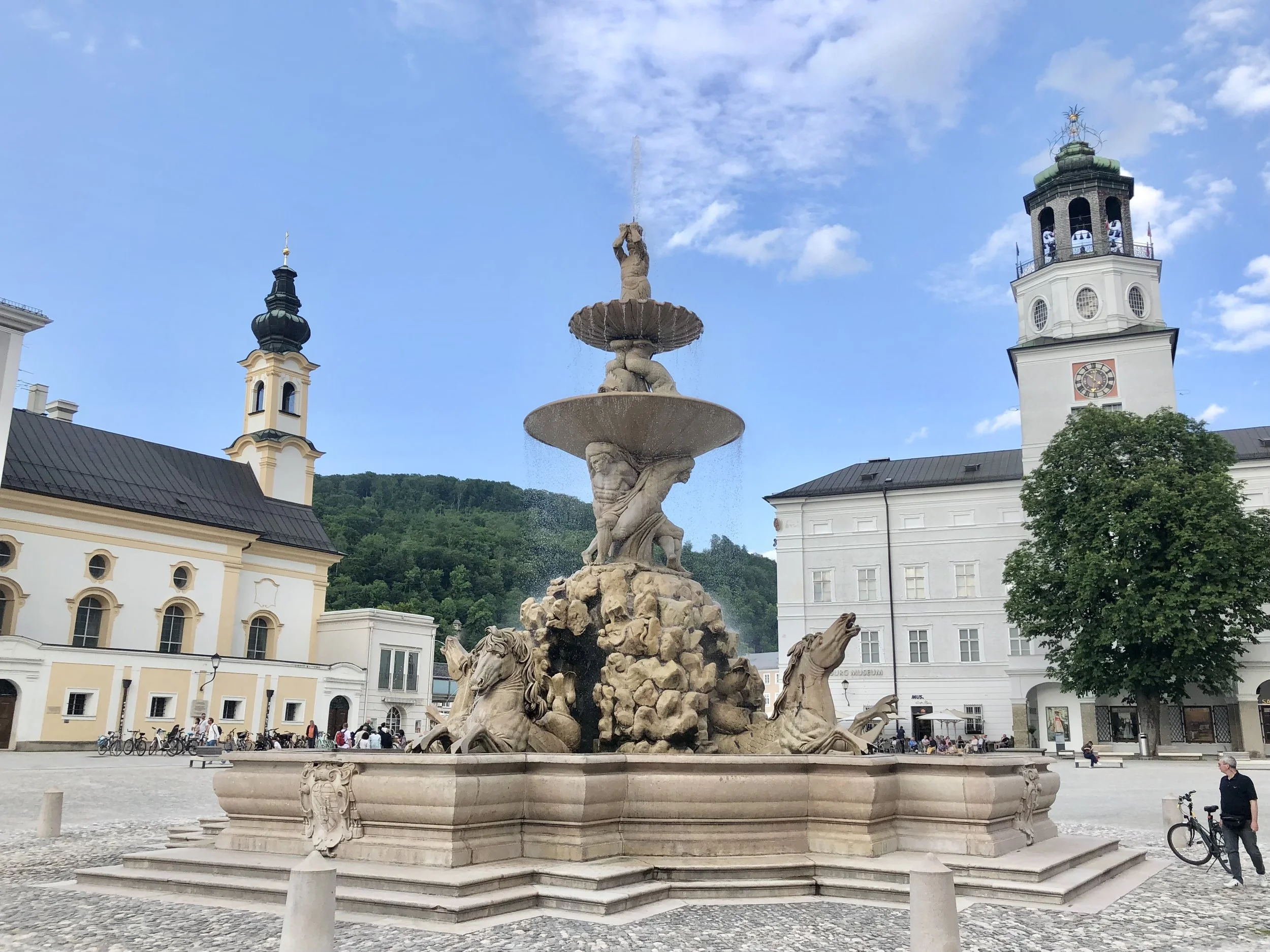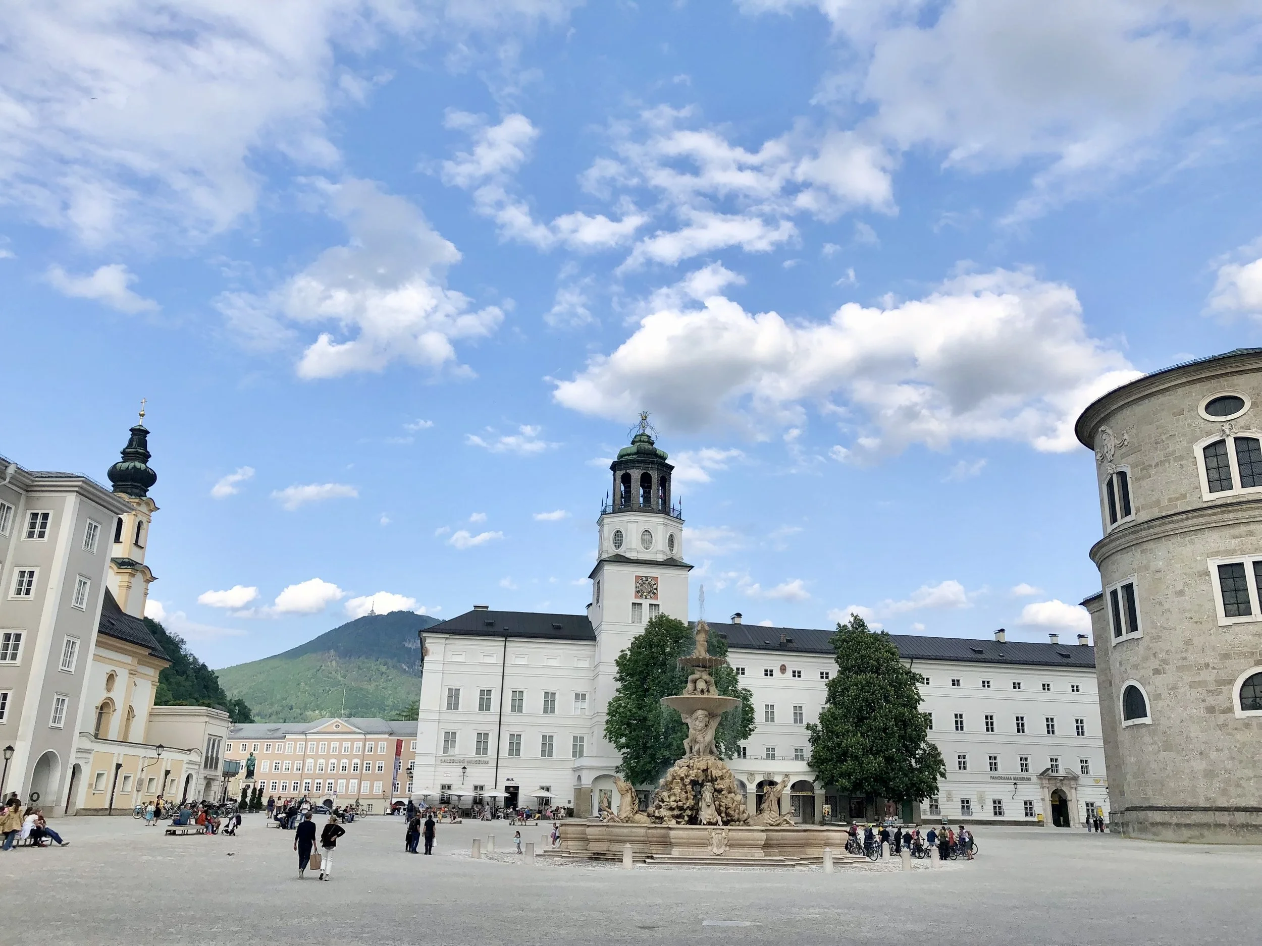 The old town contains five squares: Residenzplatz, Domplatz, Mozartplatz, Kapitelplatz and Alter Markt. “Residence Square is an especially magnificent forecourt between the archiepiscopal residences in the heart of Salzburg's Old City,” in the words of salzburg.info.