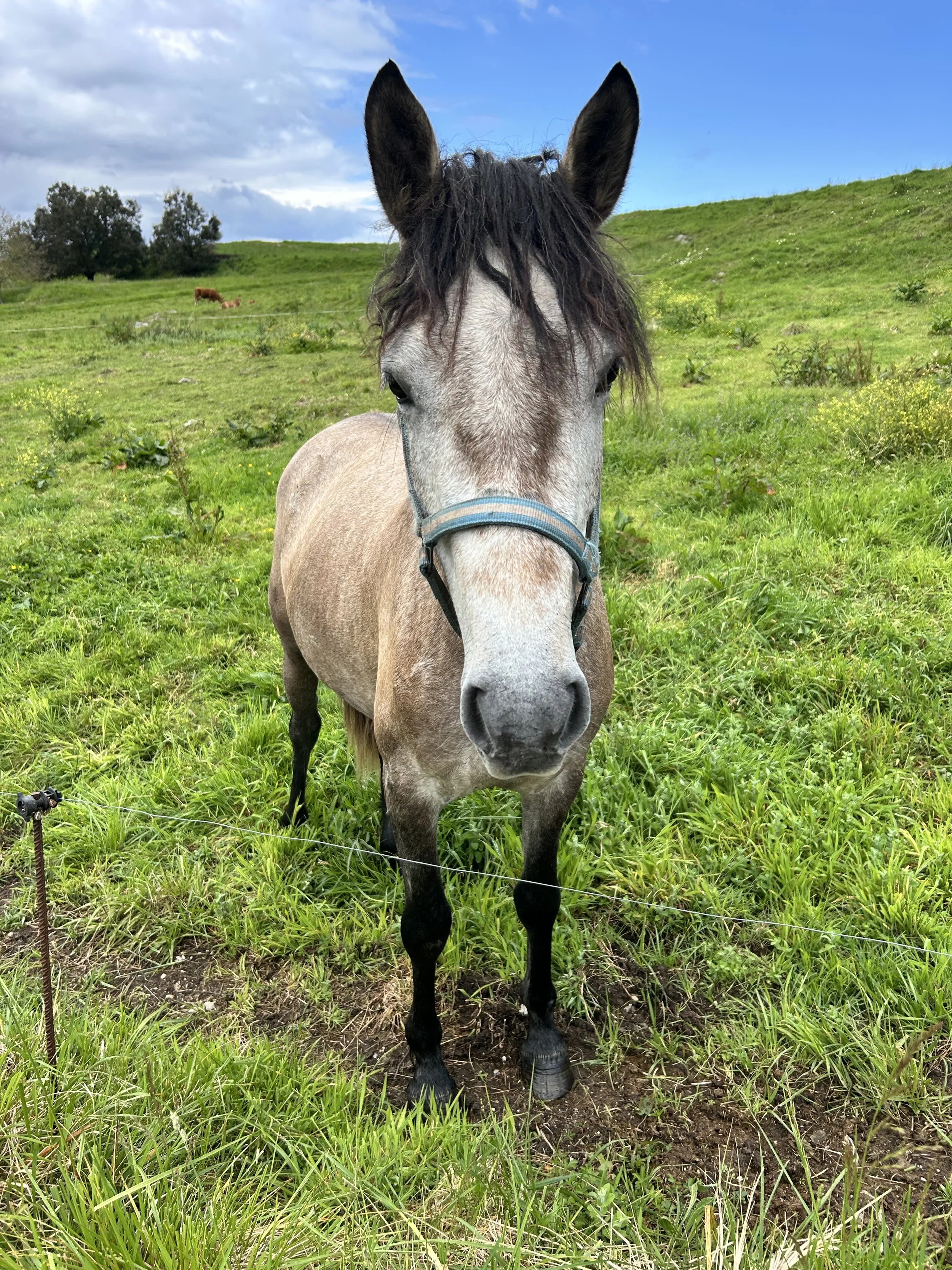 He seemed a bit lonely, so we became friends. I clucked and trotted along the fence, looking back to see if he was coming. The stallion tossed his head followed me gracefully, stopping with a halt as soon as I did. When I looked at him again and reversed direction, he followed, bucking a little as he let out the clutch. After several such trottings, we were both laughing.