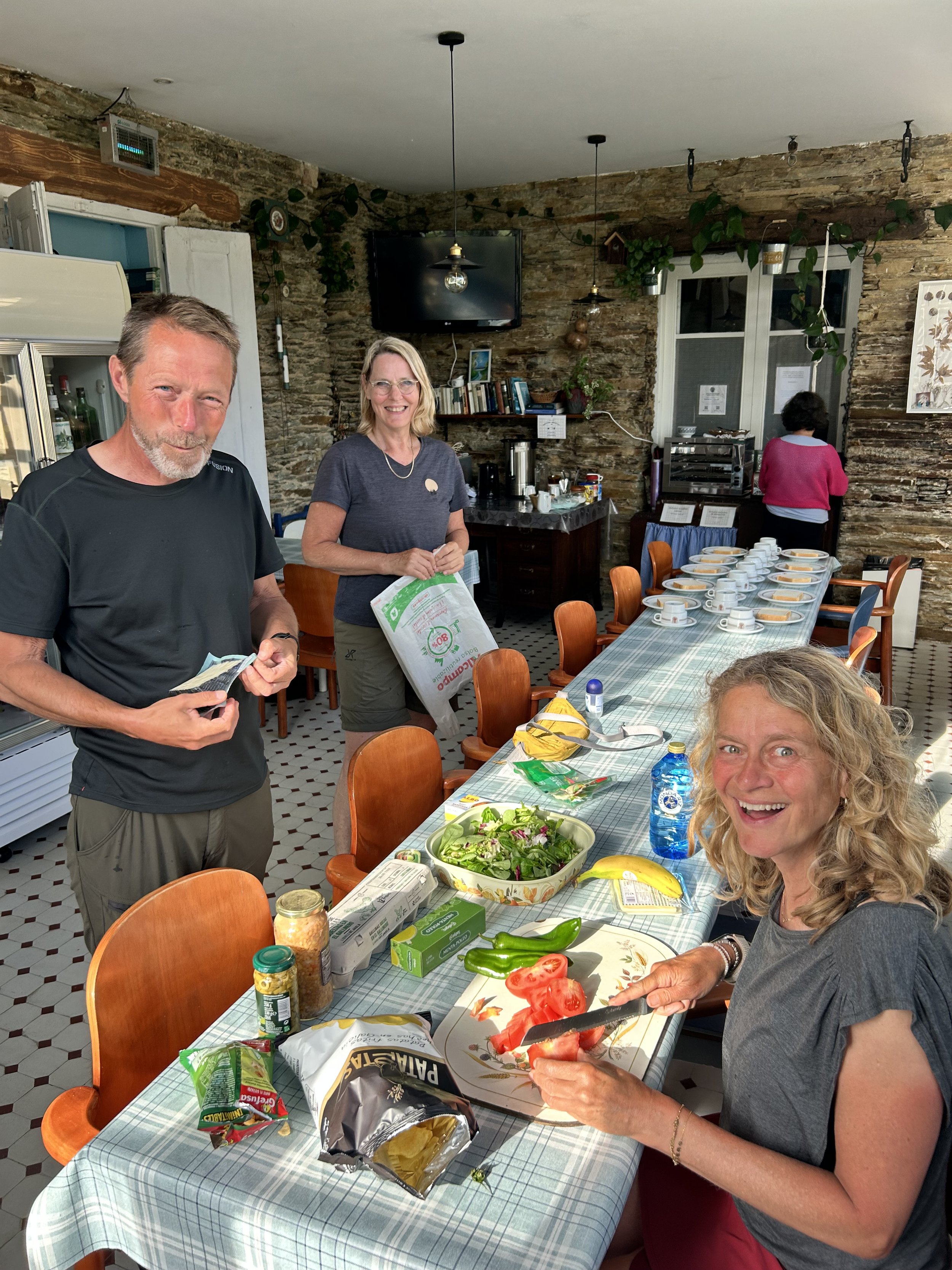 Bo from Denmark and Anika and Sophie from the Netherlands preparing dinner at Albergue Savior