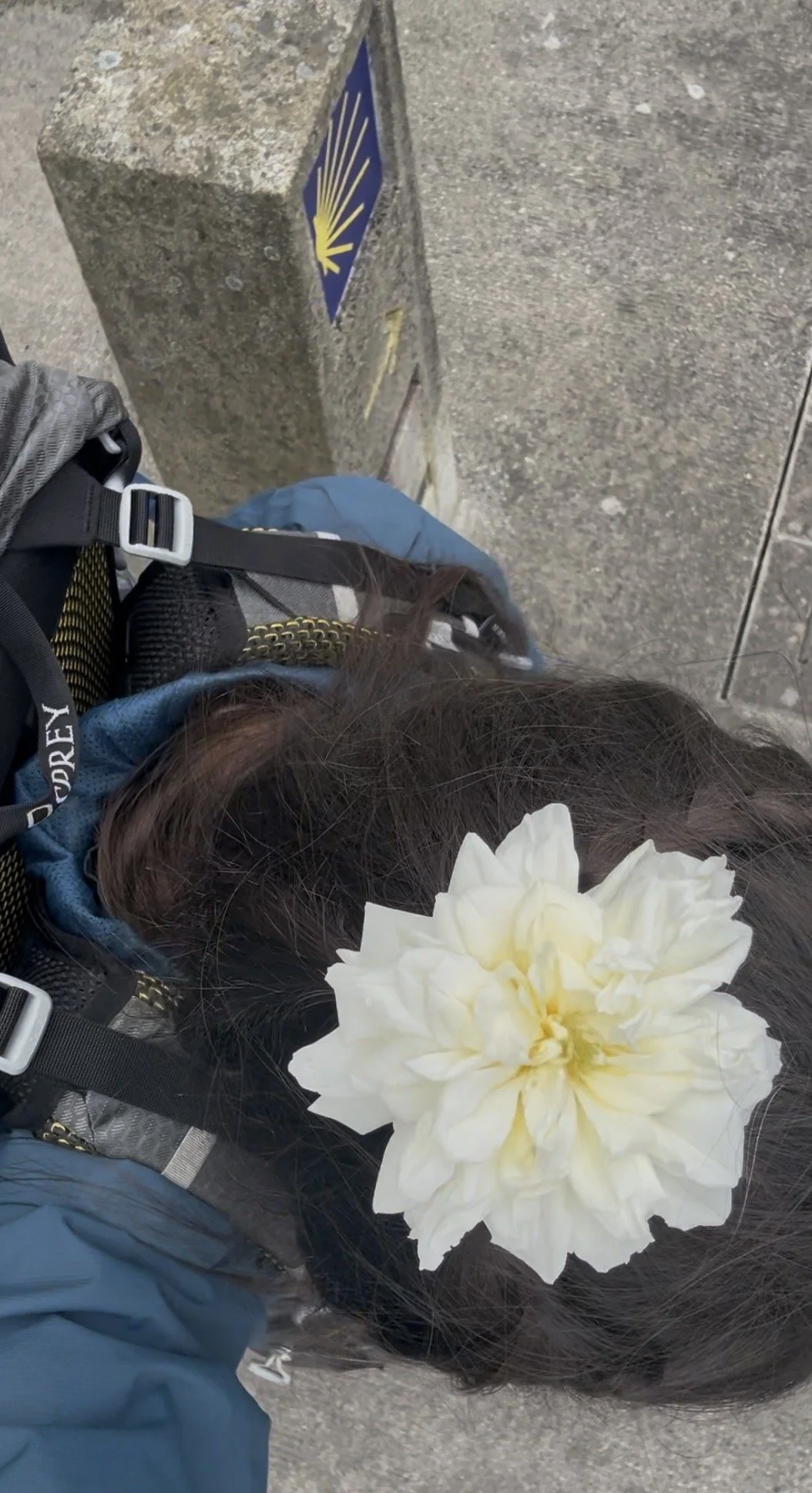 My flower “crown” and a milestone featuring the golden arrow and yellow scallop shell, symbols of the Camino