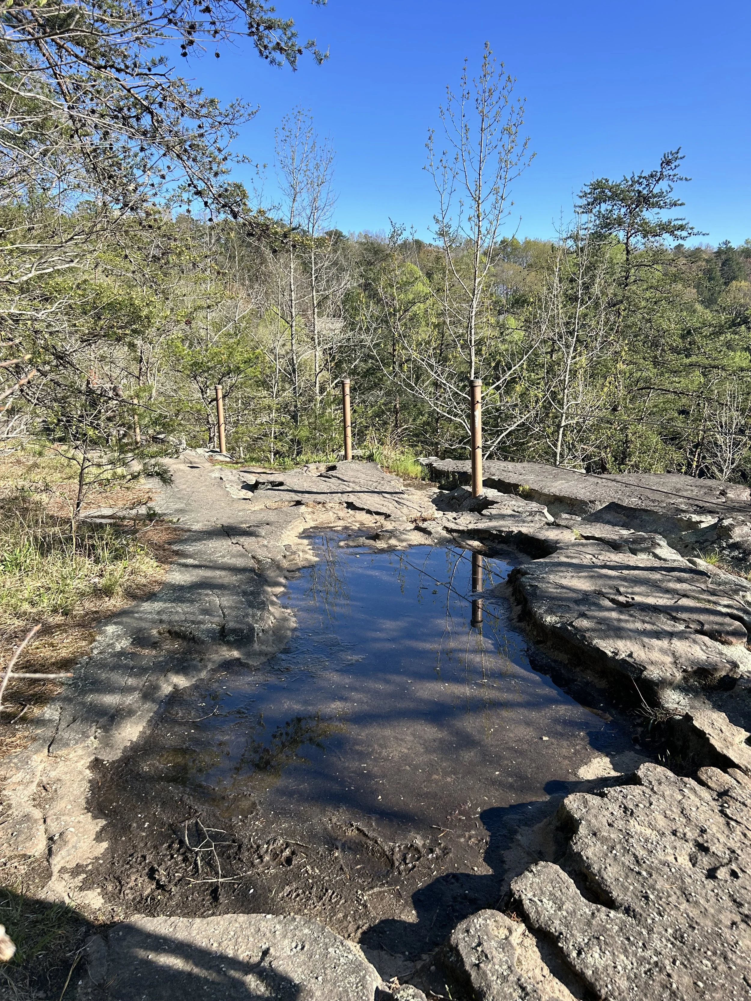 Water pooling in the sandstone near the top of the Foster Falls plunge, which is characteristic of the Cumberland Plateau
